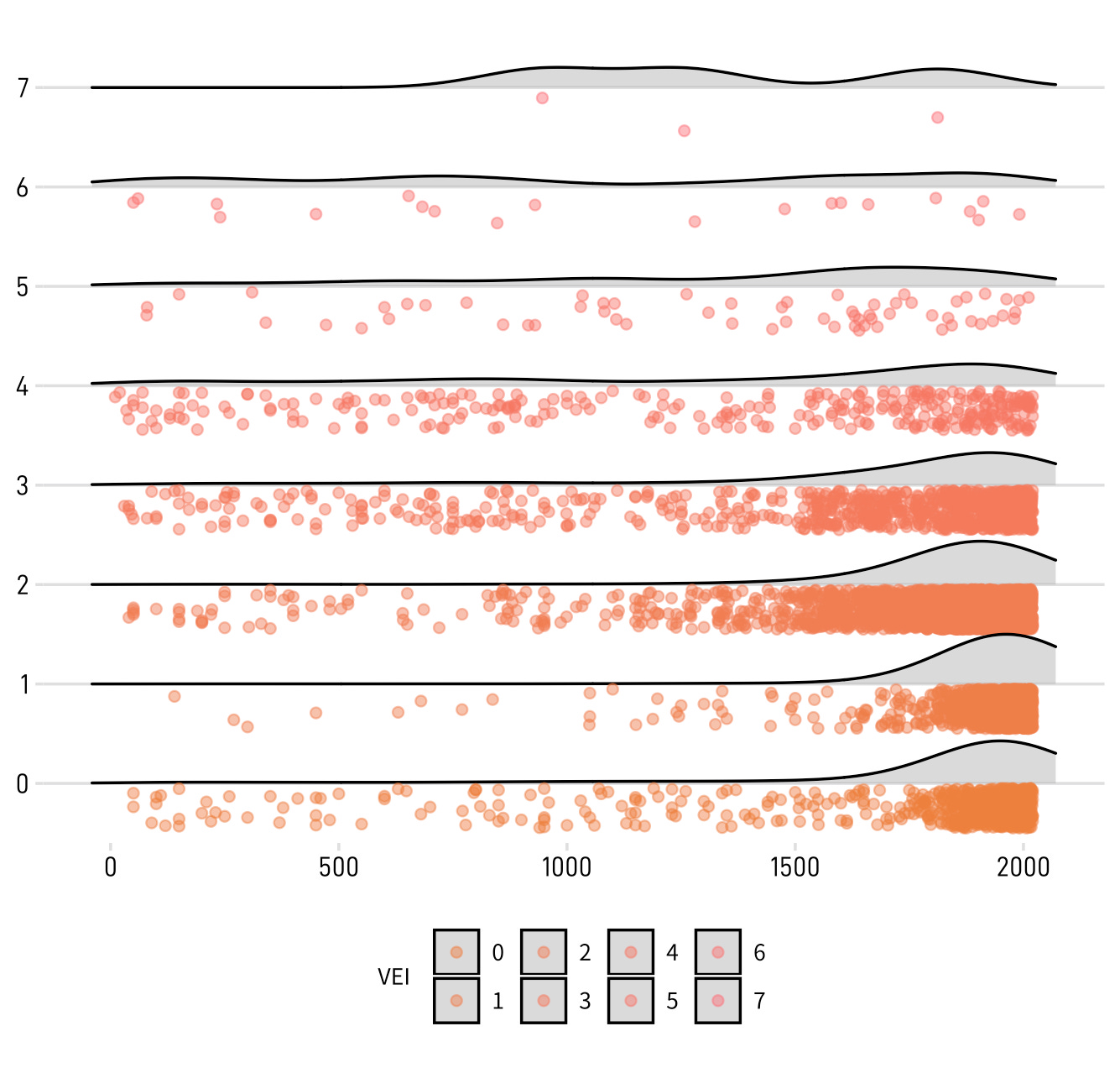 미국 스미소니언 연구소의 GVP(Global Volcanism Program)의 화산활동 데이터를 분석해 본 자료입니다. 서기 1년 이후부터 현재까지 VEI 레벨별로 얼마나 많은 화산 폭발이 있었는지 능선 플롯(ridgeline plot)으로 시각화했습니다. 능선 플롯(ridgeline plot)은 데이터의 빈도를 능선(ridgeline)을 닮은 밀도 함수로 시각화하는 차트입니다.