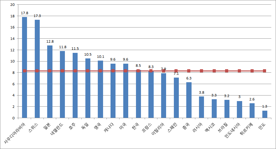 EAO(European Audiovisual Observatory)의 보고서 「Focus 2022: World Film Market Trends」 기준 우리나라는 GDP 상위 20개국 중 10위입니다.